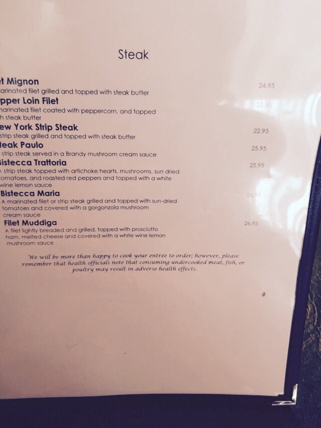 a strip steak grilled the way you like it, topped with sliced prosciutto ham and melted cheese, and covered with a white wine lemon butter sauce